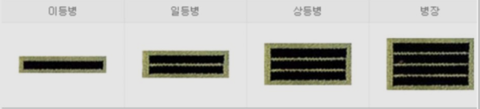 병사 계급장의 형태는 작대기 모양입니다. 순서대로 이병이 작대기 하나, 일병이 둘, 상병이 셋, 마지막으로 병장이 네개입니다. 원래는 이병과 일병 두 계급만 있었는데, 시간이 지나면서 네 개의 계급으로 바뀌게 되었습니다. 이병과 일병보다 높다고 하여 상병 그리고 병들의 대장이라고 해서 병장이라는 명칭이 붙게 되었습니다. 병사의 호칭은 군마다 다릅니다. 육군과 공군은 병사, 해군은 수병, 해병대는 해병이라고 부릅니다.