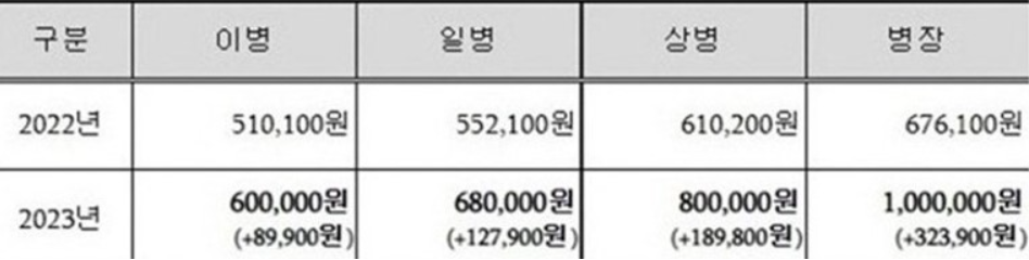 군인 월급은 직업 군인 여부와는 상관없이 해마다 물가상승률에 기준하여 상승하고 있습니다. 과거에 몇 만원 밖에 하지 않았던 월급에 비해 병사들의 월급이 꽤 높아진 것을 보니 놀랍기만 합니다.