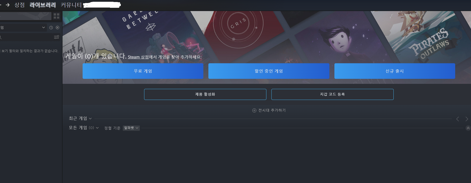 설치한 스팀계정 안으로 들어 가시면 무료게임, 할인중인 게임, 신규 출시가 있습니다. 위의 상점에서 게임구매를 하실 수 있지만 파란색 탭에서 하시면 더 편하게 구매하실 수 있습니다.