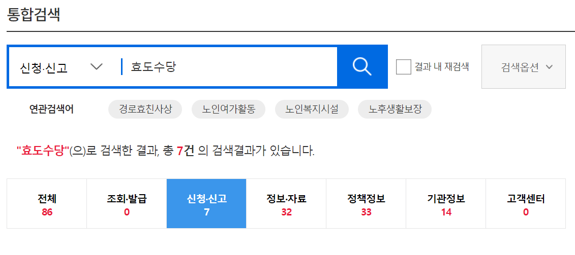 지자체에서 정부24에 올리는 것이 의무사항은 아니기 때문에 총 7건만 나와 있습니다. 대부분의 지차체에서 효도수당을 지급하기 때문에 검색 결과에 없는 경우 포기하지 마시고 해당 지자체에 직접 전화를 하시는 것이 좋습니다.
