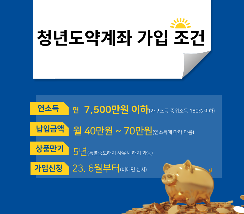 1) 청년도약계좌는 비대면 심사를 통해서 가입할 수 있습니다. 2023년 6월부터 가입신청서를 받으며, 가입 후에 1년을 주기로 개인소득을 체크하여 지원금 지급 여부와 액수를 조정한다고 합니다.